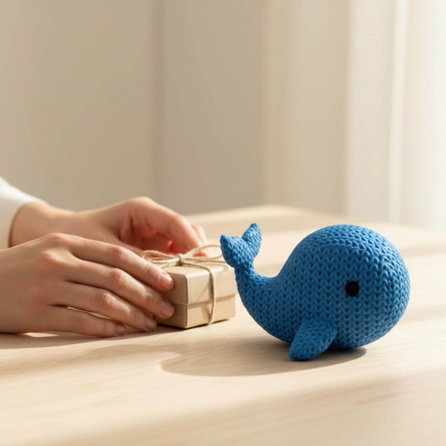 Diese Wal-Figur in moderner Strickoptik steht für Ruhe und Stärke. Die feine Struktur und die harmonische Form machen sie zu einem stilvollen Deko-Element für Regal, Sideboard oder Kinderzimmer.